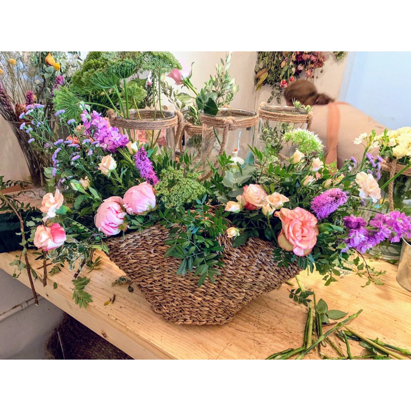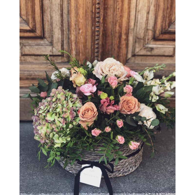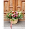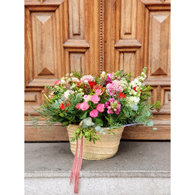 Cesta de fibras naturales de tamaño medio, rellena con flores de temporada y presentado con una elegante cinta.Disponemos de una gran variedad de cestas, de diferentes medidas y formas, para poder adaptarlos a todo tipo de presentaciones y arreglos. Escogeremos la cesta que mejor quede con tu elección. Envío sólo Madrid.