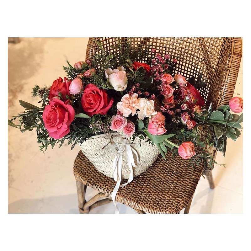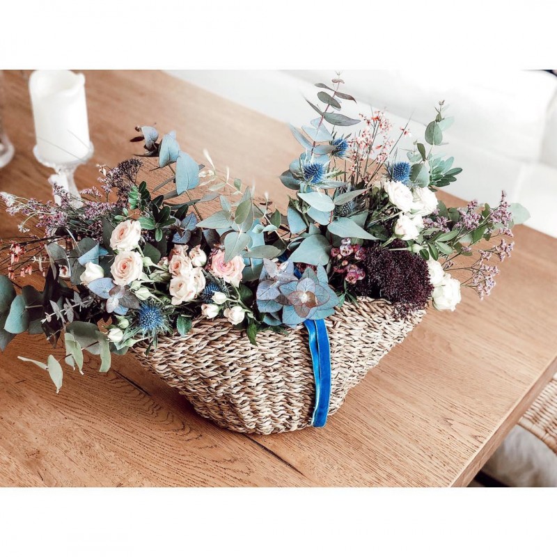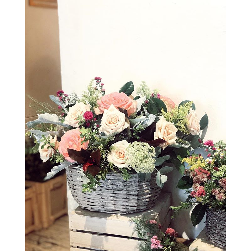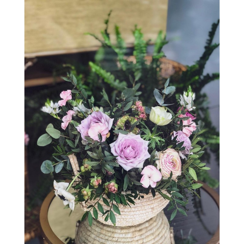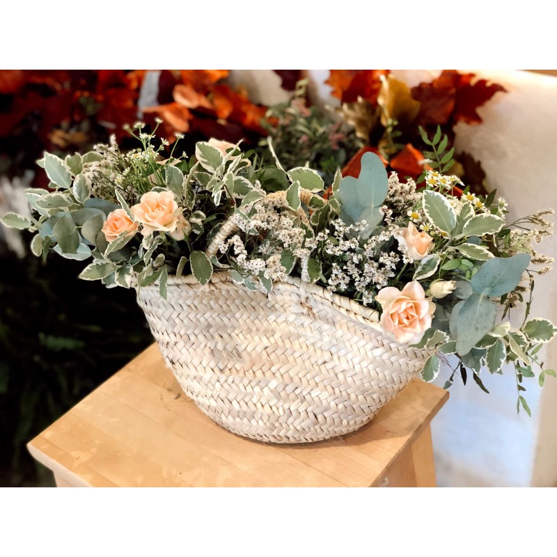 Cesta o capazo de fibras naturales de tamaño mediano, rellena con flores de temporada y presentado con una elegante cinta. Incluye el texto para la tarjeta personalizada incluida, al finalizar tu compra.
