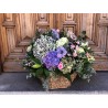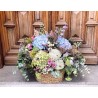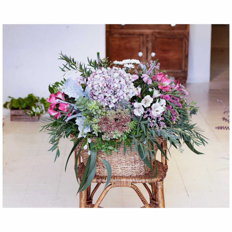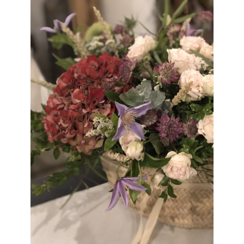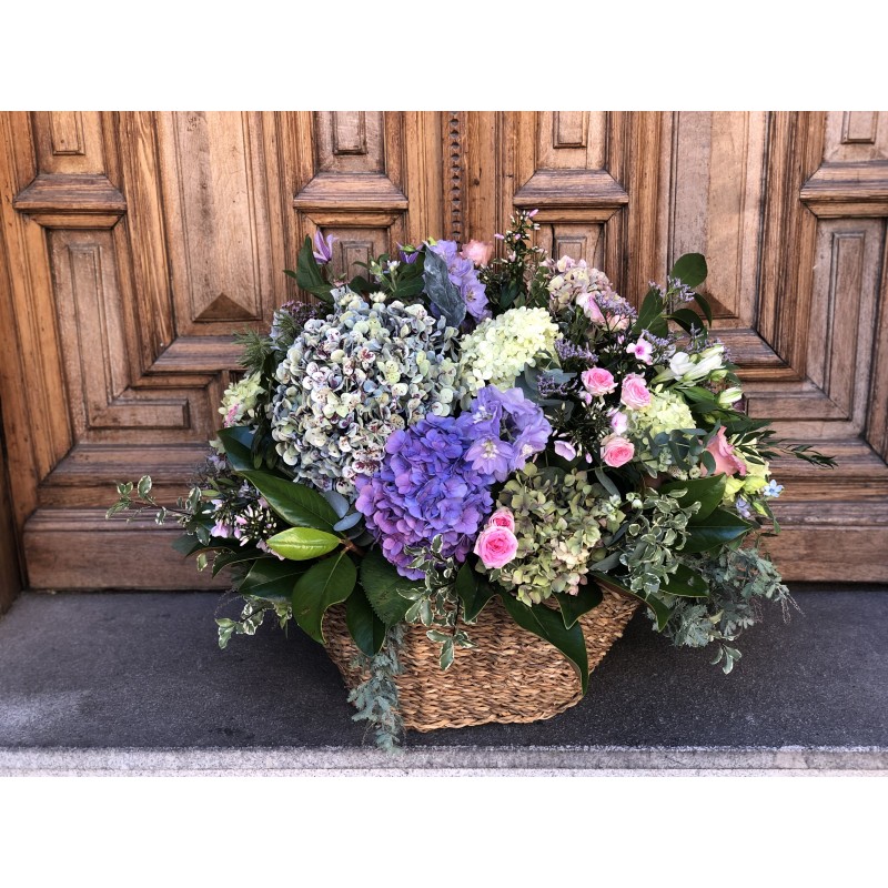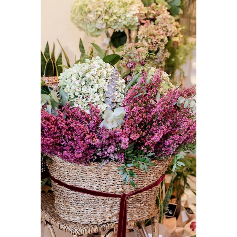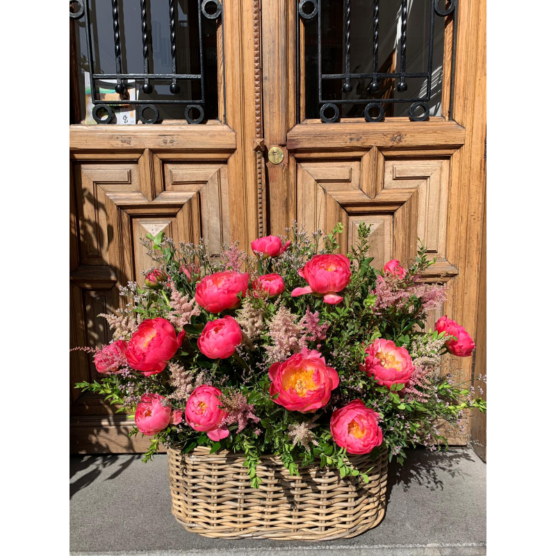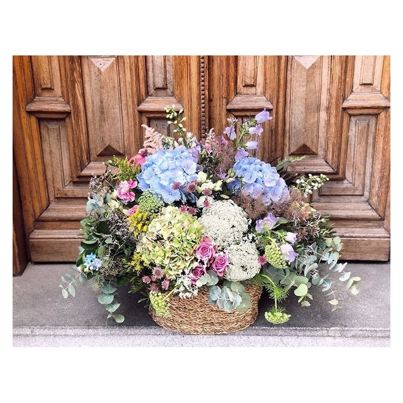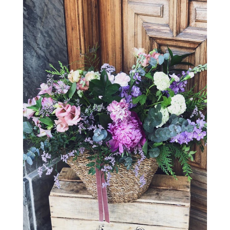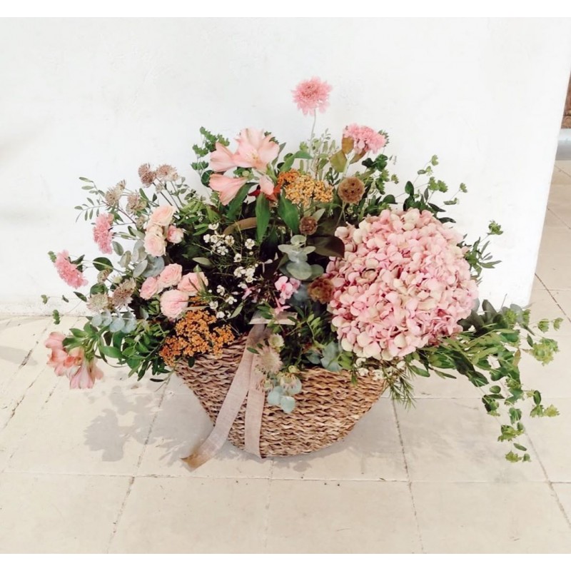 Cesta de fibras naturales de volumen extra grande con mucho volumen y variedad de flores, rellena con flores de temporada y verdes y presentado con una elegante cinta. Disponemos de una gran variedad de cestas, de diferentes medidas y formas, para poder adaptarlos a todo tipo de presentaciones y arreglos. Escogeremos la cesta que mejor quede con tu elección. Envío sólo Madrid.