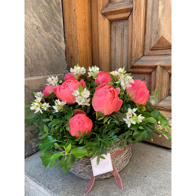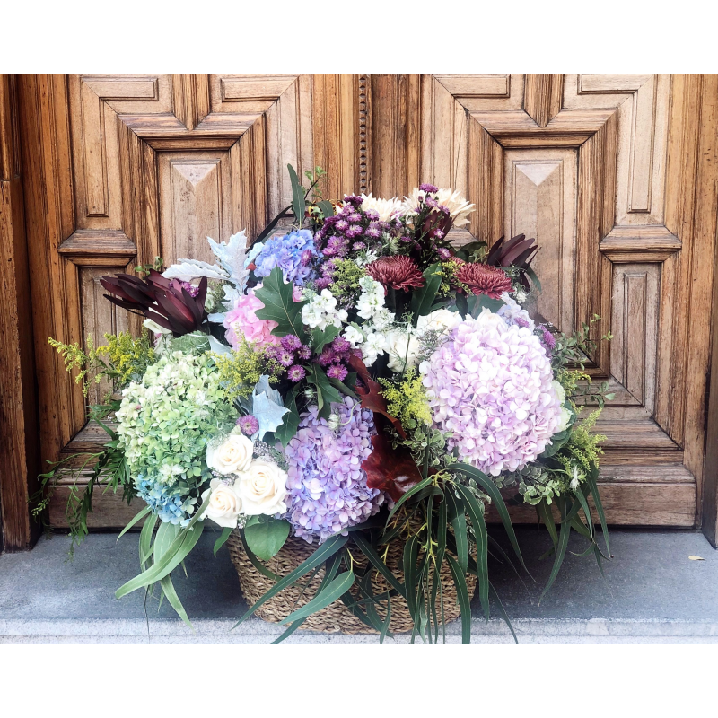 Cesta de fibras naturales de volumen extra grande con mucho volumen y variedad de flores, rellena con flores de temporada y verdes y presentado con una elegante cinta. Añade el texto para la tarjeta personalizada incluida, al finalizar tu compra.