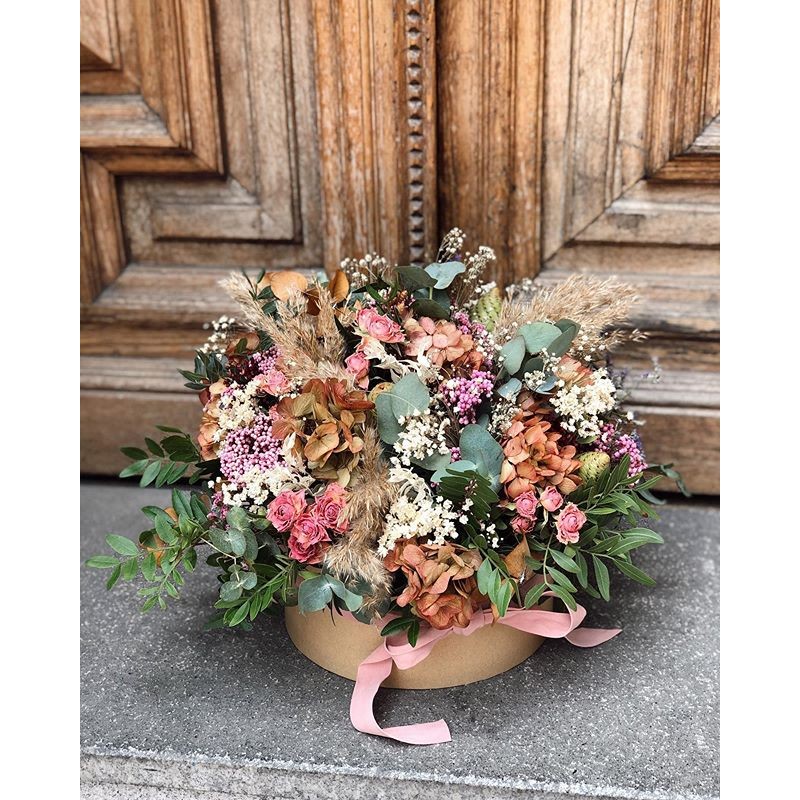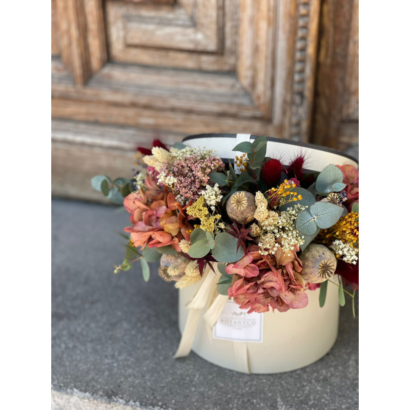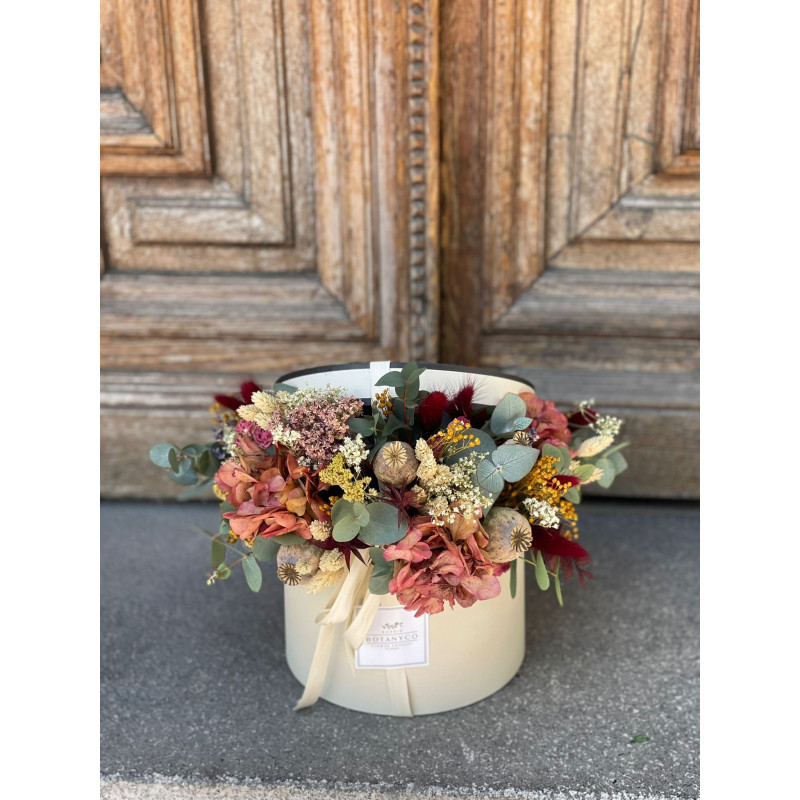 Si quieres que tus flores duren más o eres amante de las flores secas y preservadas, ésta es tu bombonera. Confeccionada con verdes naturales y variedades de flores naturales que secan de maravilla y combinado con flores secas y preservadas, para asegurar que tu caja se mantendrá igual de espectacular durante mucho tiempo. Sólo debes cuidar que no se acumule el polvo en las hojas y las flores y verás como se mantiene perfecto. Añade el texto para la tarjeta personalizada incluida, al finalizar tu compra. Envío Madrid y península.