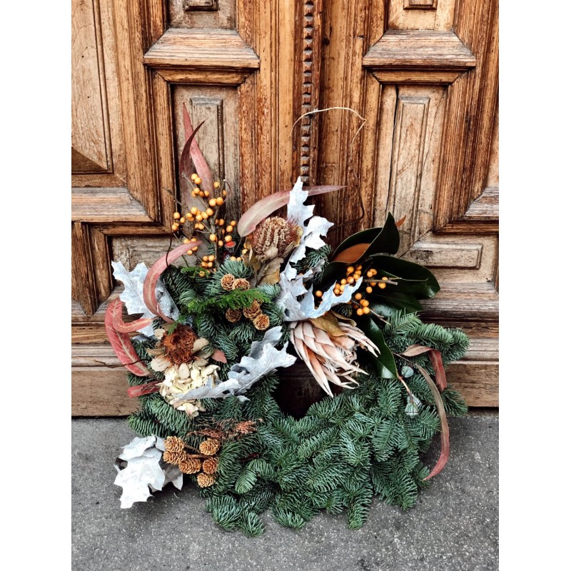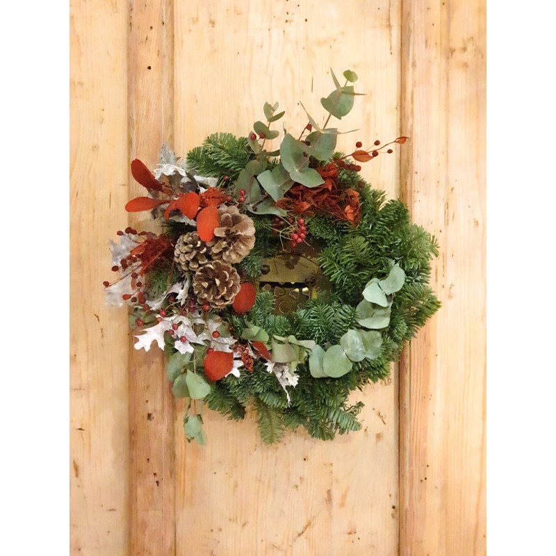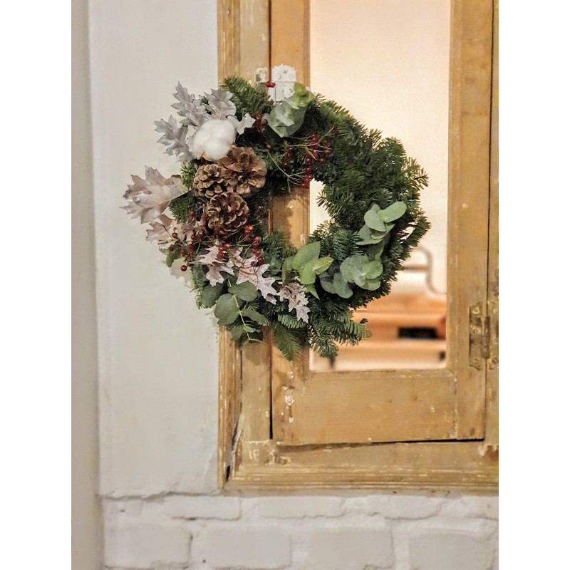 Corona de Navidad de 30cm de diámetro confeccionada con una base de abeto natural y adornada con diferentes verdes, flores y frutos, típicos de la Navidad. Se presenta con tira de rafia natural para poder colgarla y tarjeta especial Navidad Botanyco. Complétalo con una tarjeta con tu texto personalizado, y la recibirás, envuelta en papel de estraza y cuerda natural. El regalo perfecto para estas Navidades.