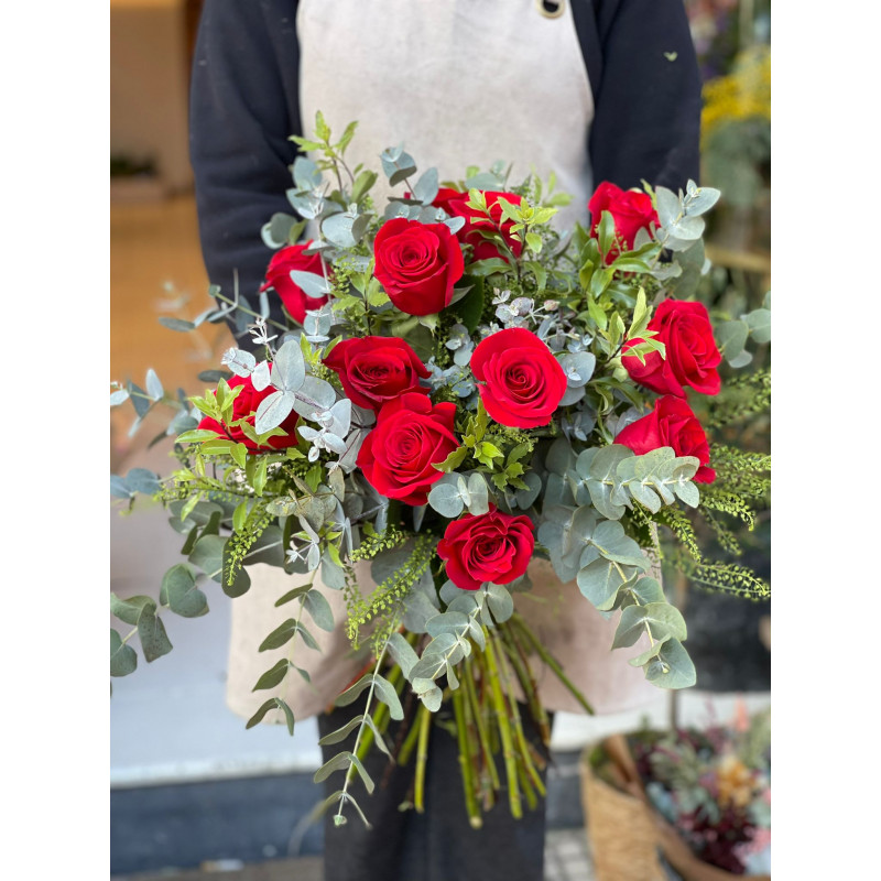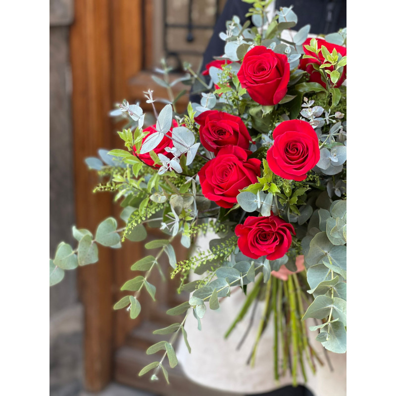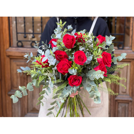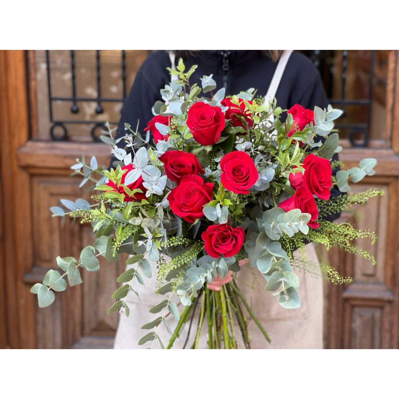 Ramo clásico 12 rosas rojas, formado por una docena de rosas rojas, acompañado por diferentes variedades de verdes naturales y presentado en un bonnito envoltorio de papel, cerrado con cinta de algodón natural y etiqueta especial Botanyco. Ideal para San Valentín.