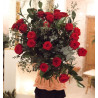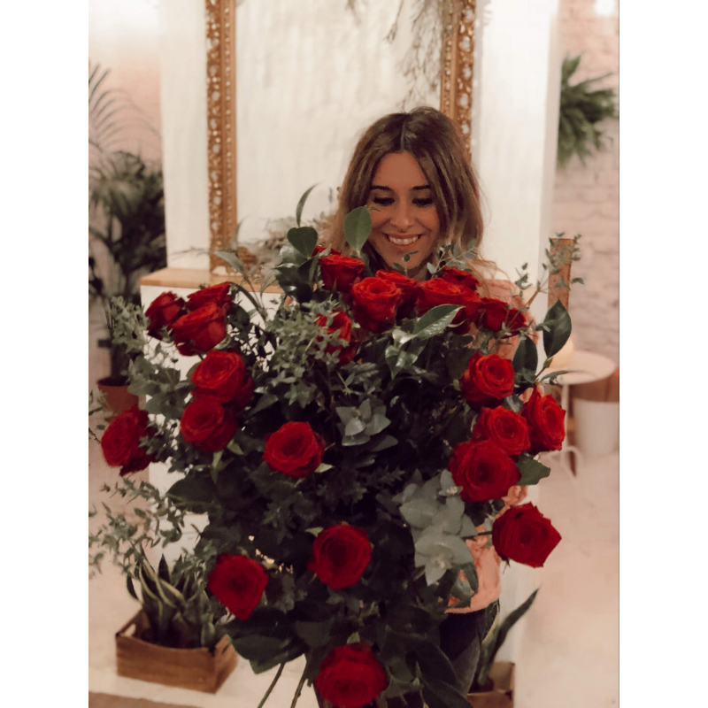 Ramo extra grande de 24 rosas rojas. Súper voluminoso e impresionante. formado por dos docenas de rosas rojas, acompañado por diferentes variedades de verdes naturales y presentado en un bonito envoltorio de papel, cerrado con cinta de algodón natural y etiqueta especial Botanyco. Ideal para San Valentín.