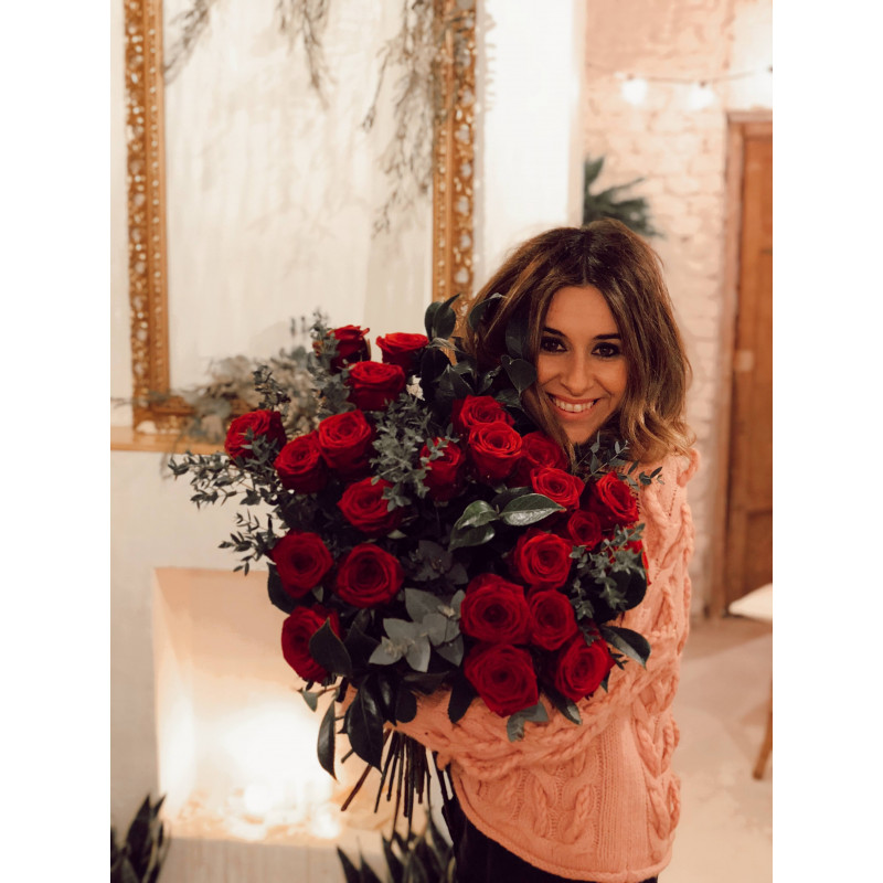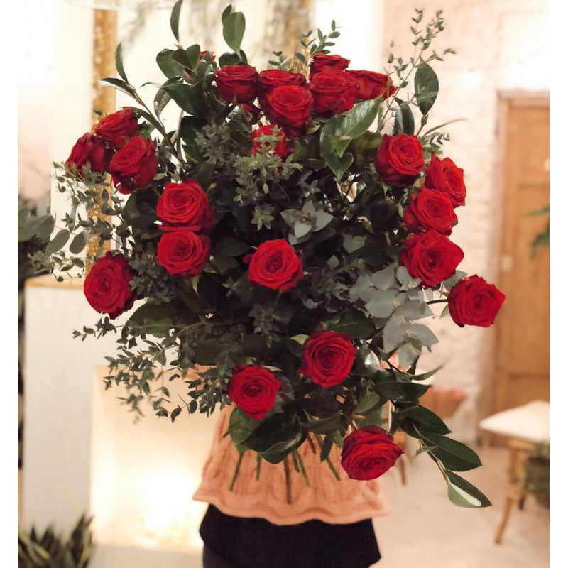 Ramo extra grande de 24 rosas rojas. Súper voluminoso e impresionante, formado por dos docenas de rosas rojas, acompañado por diferentes variedades de verdes naturales y presentado en un bonito envoltorio de papel, cerrado con cinta de algodón natural y etiqueta especial Botanyco. Un ramo clásico, capaz de expresarlo todo sin palabras.