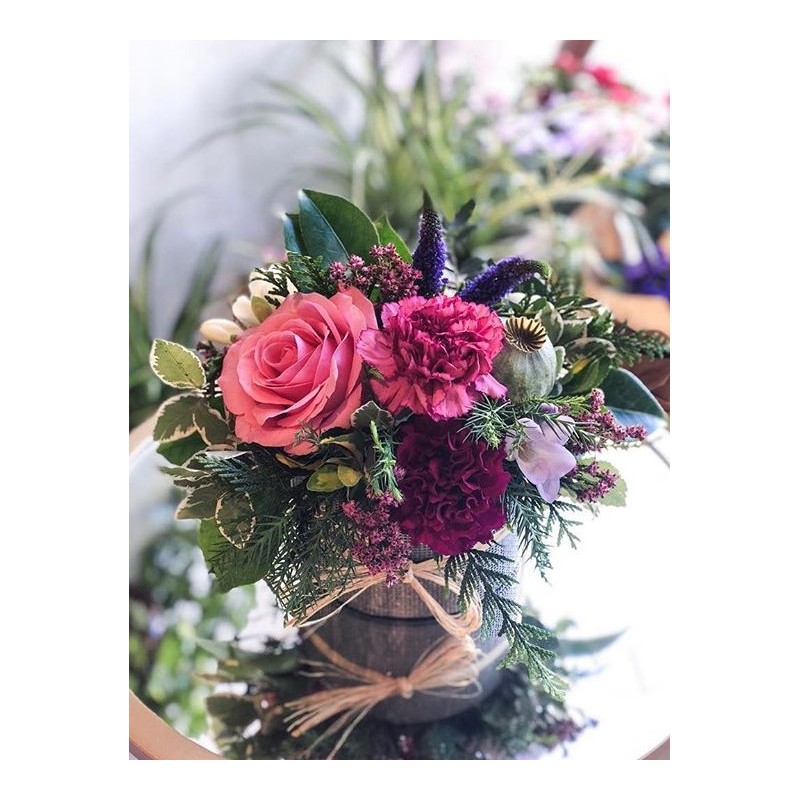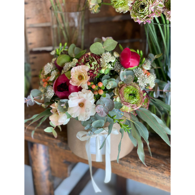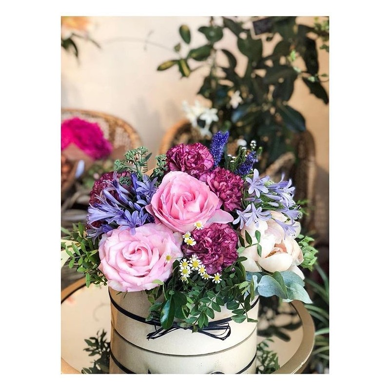 Nuestra cajita redonda más pequeña. Coquetas bomboneras forradas en tela o cartón, de distintos colores, rellenas con flores de temporada para lograr un resultado espectacular. Incluye el texto para la tarjeta personalizada incluida, al finalizar tu compra.