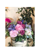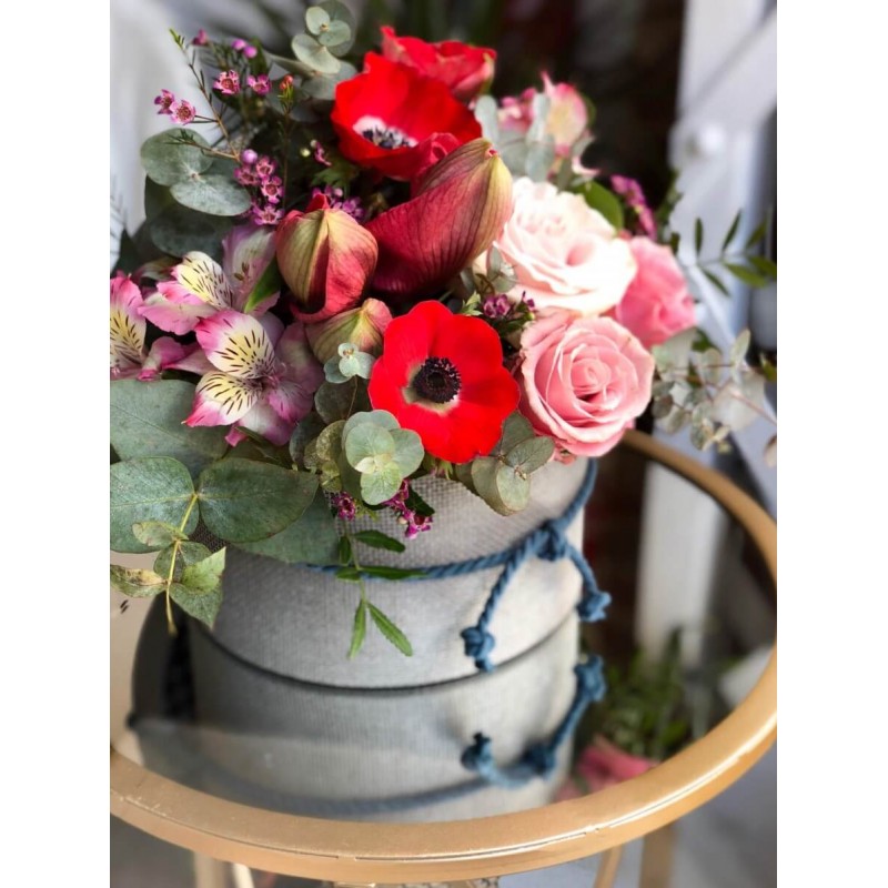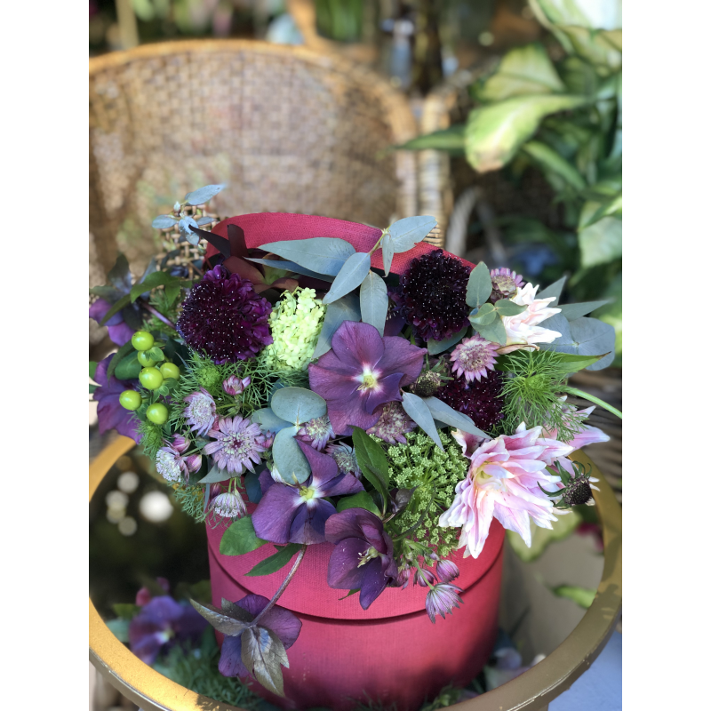 Nuestra cajita redonda más pequeña. Coquetas bomboneras forradas en tela o cartón, de distintos colores, rellenas con flores de temporada para lograr un resultado espectacular. Envío sólo Madrid.