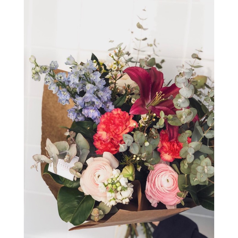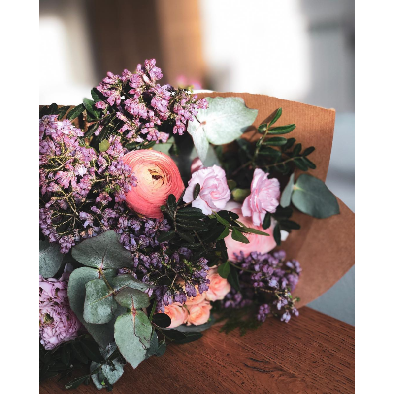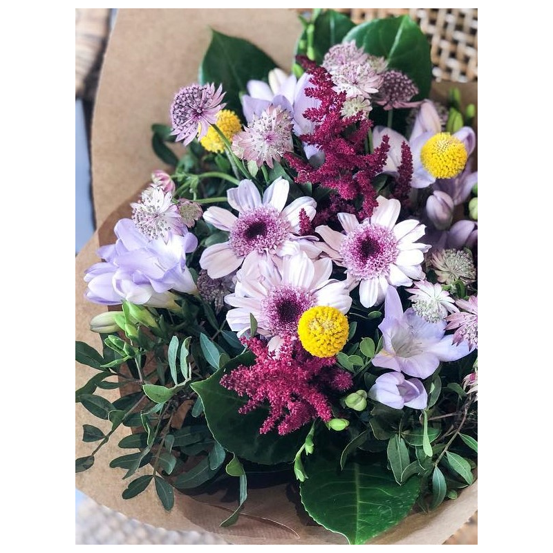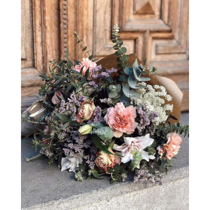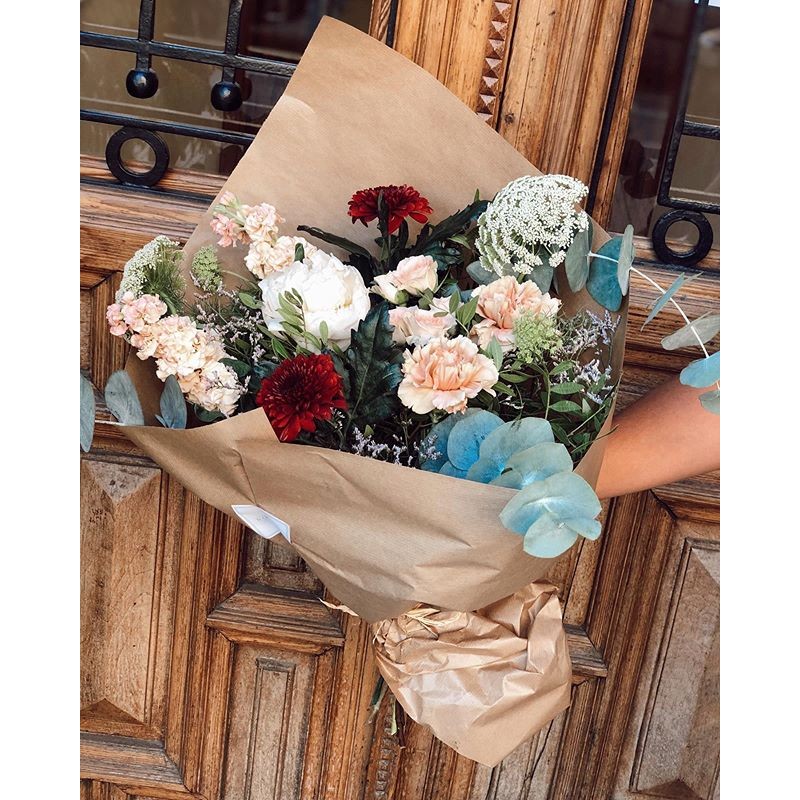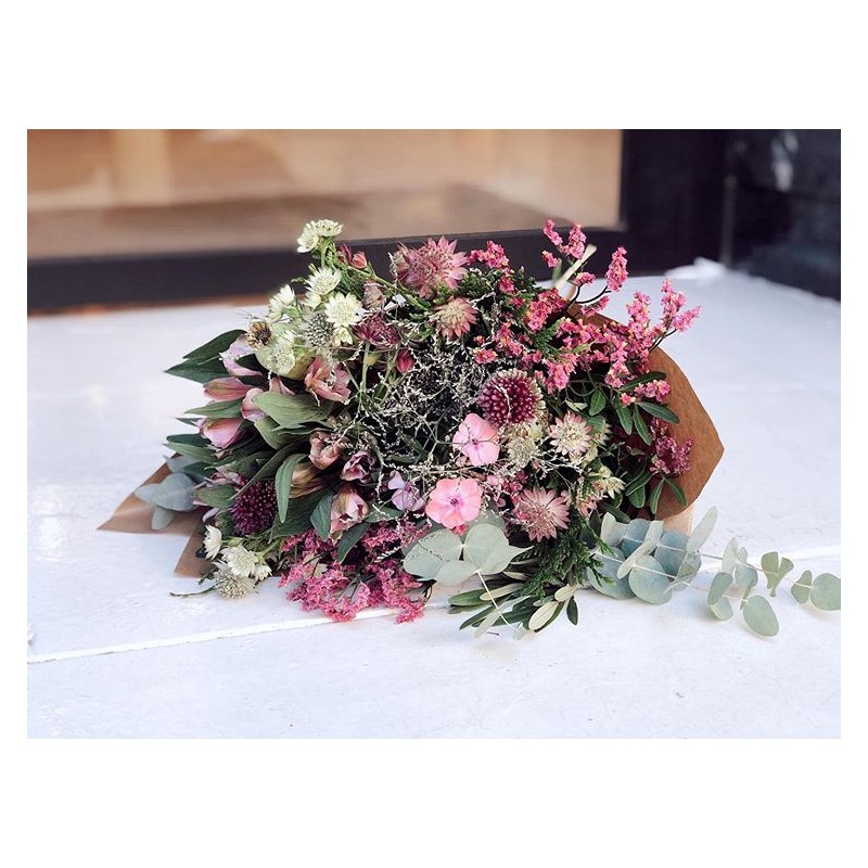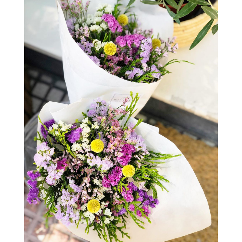 Ramos sencillos y vistosos de flor de temporada. Escoge la tonalidad de las flores que más vaya con tu estilo. Los ramos se presentan en papel estraza y rafia natural y puedes personalizarlos con un mensaje en una de nuestras tarjetas que incluiremos en el ramo.